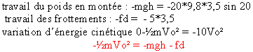 Chute libre. Texte : la vitesse initiale est nulle. L'altitude initiale vaut h. L'objet parcourt 9,5 m lors de la dernière seconde de chute. Analyse : Question relative à la vitesse ( km/h) d'arrivée au sol. ( 31 ; 38 ; 49 ; 52 ; 54 ; aucune réponse exacte ) On choisit un axe vertical orienté vers le bas ; l'origine est la position initiale. z(t) = ½gt2 ; On note t la durée de la chute : h = ½gt2 soit t = (2h/g)½. h = ½gt2 ; h-9,5 = ½g(t-1)2 ; 9,5 =½gt2- ½g(t-1)2 ; 2*9,5/9,81 = t2-(t-1)2 ; 1,937 = (2t-1) ; t = 1,468 s. vitesse v = gt ; v = 9,81*1,468 = 14,4 m/s ; 14,4 *3,6 =52 km/h.