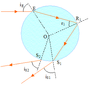 La goutte d'eau est supposée sphérique. Sur le schéma figurent la trajectoire de la lumière de longueur d'onde l1 ( réfraction suivant ER1, puis réflexion suivant R1S1, réfraction en S1 et sortie sous l'angle iS1) et le rayon émergeant en S2 avec un agle iS2 correspondant à une longueur d'onde l2. L'indice de l'eau est une fonction décroissante de la longueur d'onde. nair = 1.