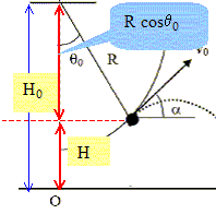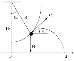La masse m est libérée avec une vitesse v0. On prendra g=10 N/kg et Ep=0 pour H=0 (au niveau du sol). La hauteur H par rapport au sol quand le pendule est à l'angle q0 est H= H0-R cos q0. Vrai.