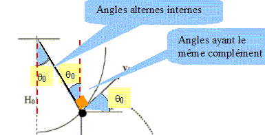 Si le pendule a une amplitude maximale qmax, la vitesse v0 au point q0<qmax est : [2gR(cosq0-cosqmax)]½. Vrai. Au point d'amplitude angulaire qmax, la vitesse est nulle. L'énergie du pendule est sous forme potentielle de pesanteur : EM = mg( H0-R cos qmax). Au point d'amplitude angulaire q0, la vitesse est v0. L'énergie du pendule est sous forme potentielle de pesanteur et cinétique : EM =mg( H0-R cos q0) + ½mv20. Ecrire la conservation de l'énergie mécanique , en l'absence de frottement : mg( H0-R cos qmax) = mg( H0-R cos q0) + ½mv20. -R gcos qmax= -Rg cos q0 + ½v20 ; v20 = 2gR(cosq0-cosqmax). La vitesse v0 fait un angle q0 par rapport à lhorizontale. Vrai.