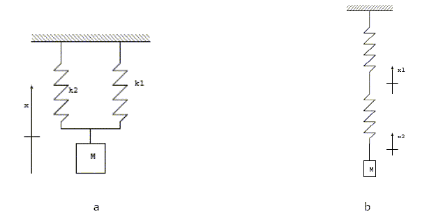 La période est proportionnelle à la racine carrée de la masse. La période d'oscillation de la masse M à vide est de 2p(M/k)½ où k est la constante de raideur du ressort. Vrai. On considère deux ressorts identiques de même raideurs k. On peut les combiner ensemble soit en série (a) soit en parallèle (b).