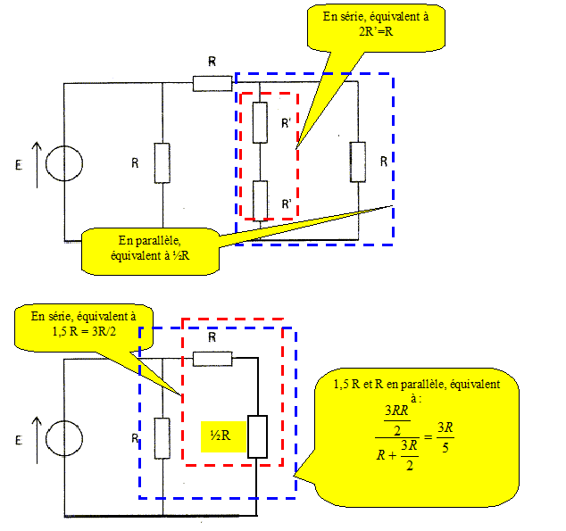 E= 12 V ; R=50 W. L'intensité du courant circulant dans le circuit est :4 A ; 0,14 A ; 0,4 A ; autre réponse. I= E / Réquivalent = E*5/(3R) =12*5/(3*50) =0,4 A. |