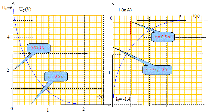 Analyse : Question relative à la valeur de R. La valeur maximale de l'intensité est égale à : i0 = -U0/R avec U0 = 6 V et i0 = -1,4 10-3 A d'où R = 6/1,4 10-3 = 4,3 kW. Question relative à la valeur de C.