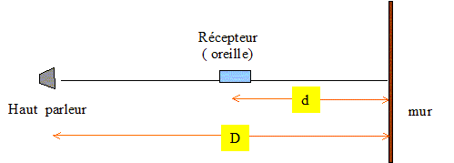 réflexion d'une onde sur un mur. Texte : Fréquence de l'onde : f = 1000 Hz ; célérité cair = 340 m/s ; L = 100 m. L'onde émise par le haut parleur se réfléchit sur le mur. L'oreille perçoit deux sons distincts si l'intervalle de temps séparant leurs réceptions est supérieur à 0,10 s. Analyse : Question relative à la distance d conduisant à la réception d'un seul son. L'onde incidente atteint l'auditeur à la date t1 =(L-d)/cair. L'onde incidente atteint le mur et se réfléchit à la date t =L/cair. L'onde réfléchie atteint l'auditeur à la date t2 =t+d/cair=( L+d)/cair. t2-t1 =2d/cair. L'oreille perçoit un son unique si t2-t1 est inférieur ou égal à 0,1 s. t2-t1 < =0,1 ; 2d/cair < =0,1 ; d < ½(t2-t1 )cair ; d <0,5* 0,1 *340 ; d <17 m.